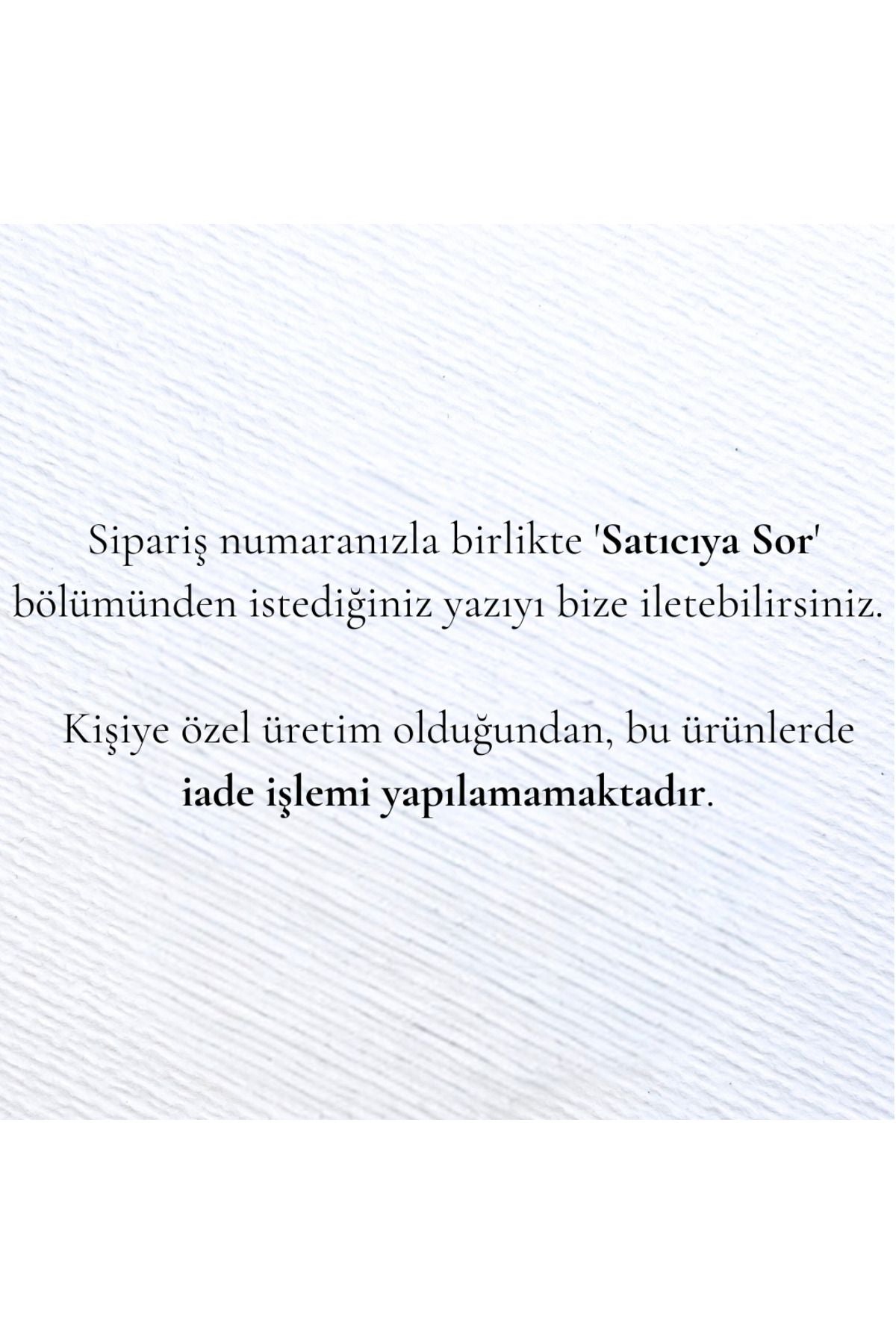 - "Sipariş numaranızla birlikte 'Satıcıya Sor' bölümünden istediğiniz yazıyı bize iletebilirsiniz. Kişiye özel üretim olduğundan, bu ürünlerde iade işlemi yapılamamaktadır."