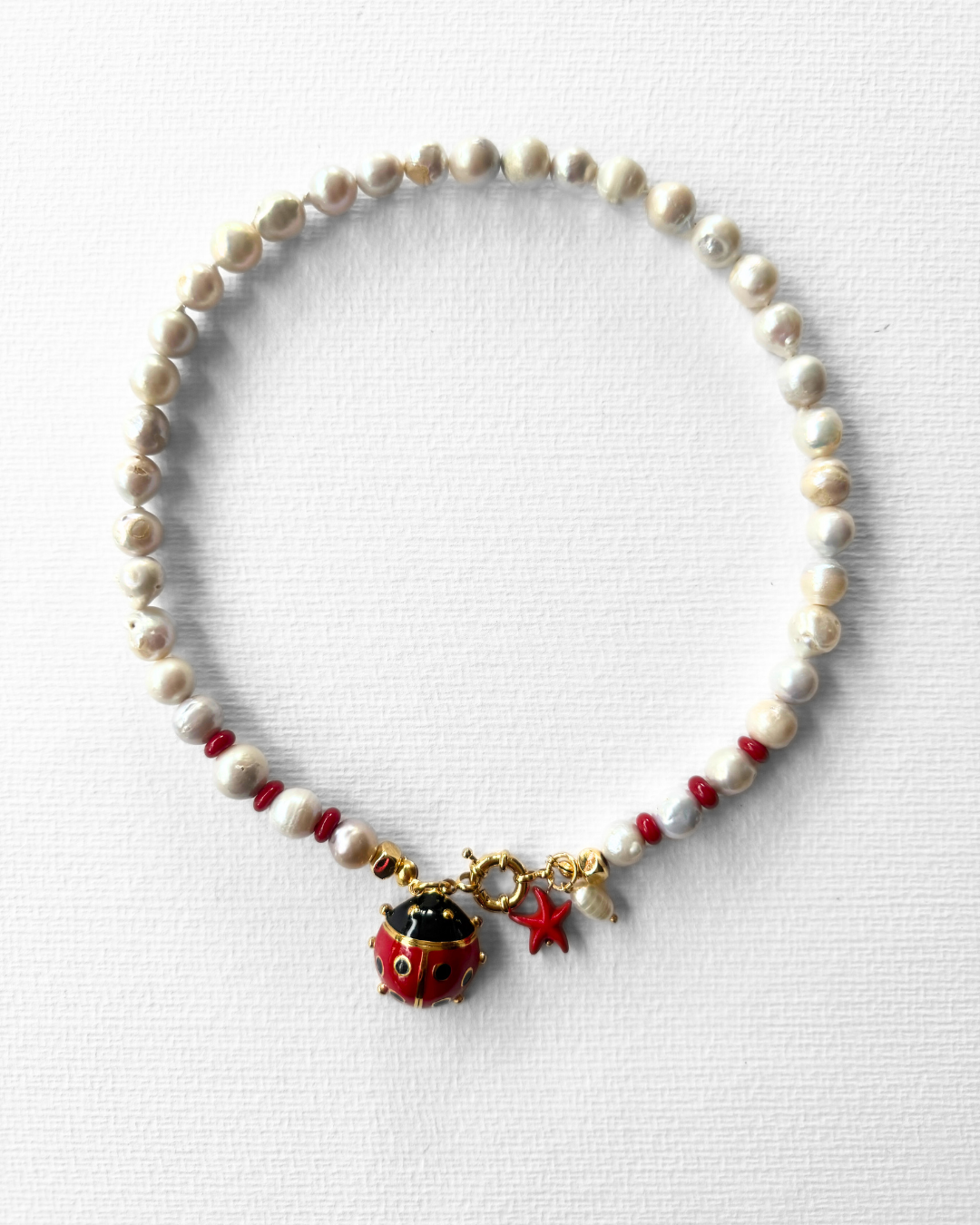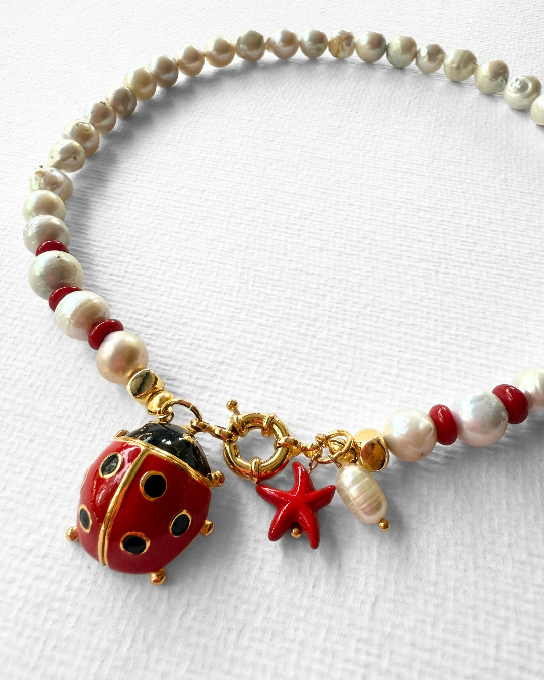 Kolyede yer alan uğur böceği, şansı ve korunmayı simgelerken; deniz yıldızı ise sabır, denge ve içsel gücün sembolüdür. Her biri yalnızca bir süs değil, küçük ama anlamlı birer detay olarak tasarlandı.