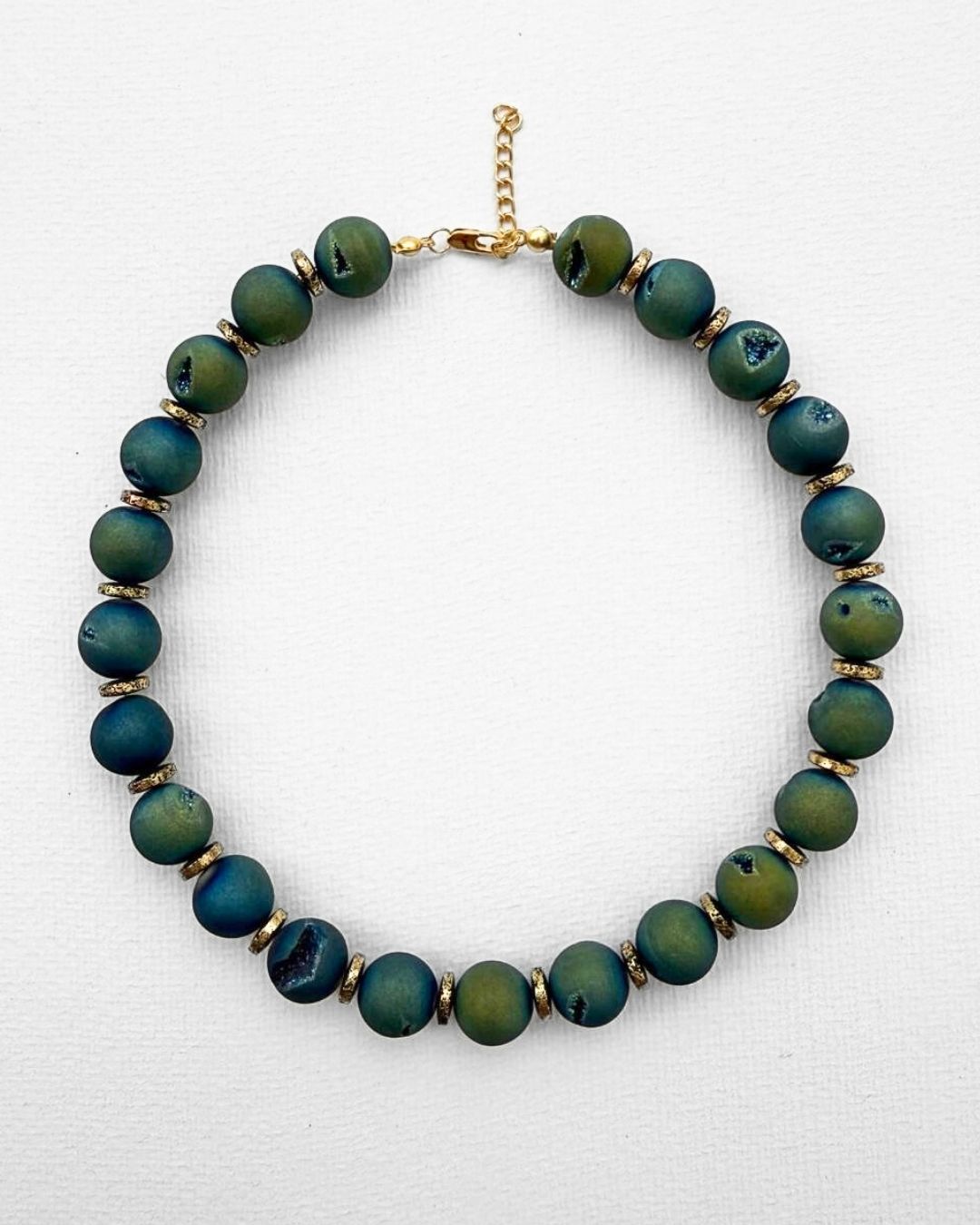 El yapımı bu özel kolyede, doğal druzy akik taşlarının mat dokusu ile lav taşının eşsiz parıltısı bir araya geliyor. Her biri kendine özgü yüzeye ve enerjiye sahip bu taşlar, hem günlük stilinize sofistike bir dokunuş katar hem de güçlü bir anlam taşır.