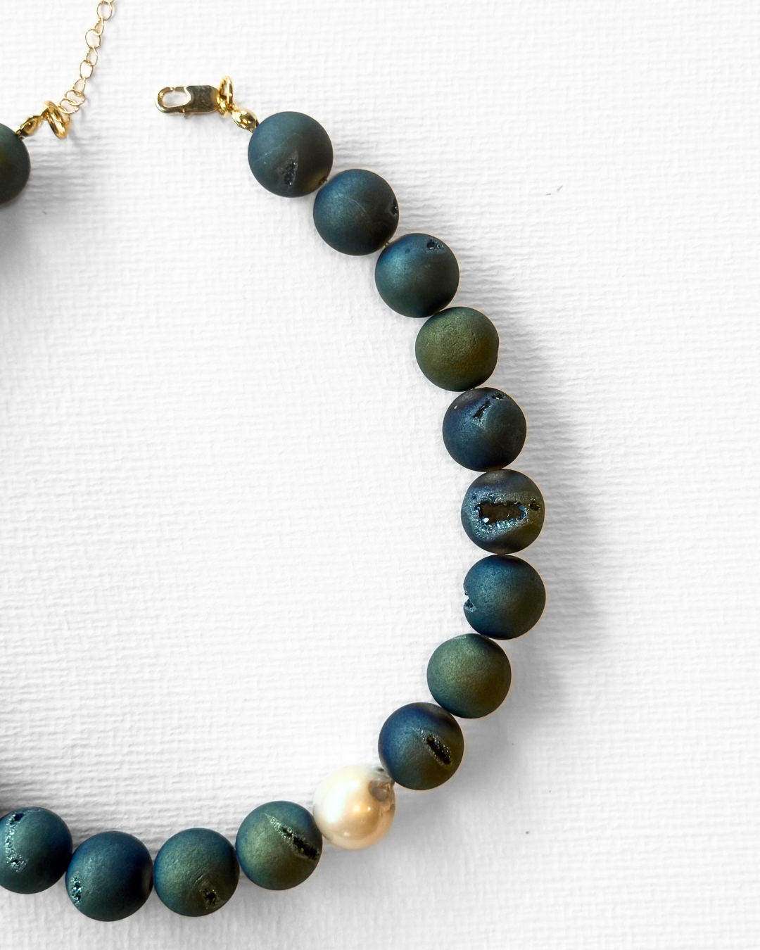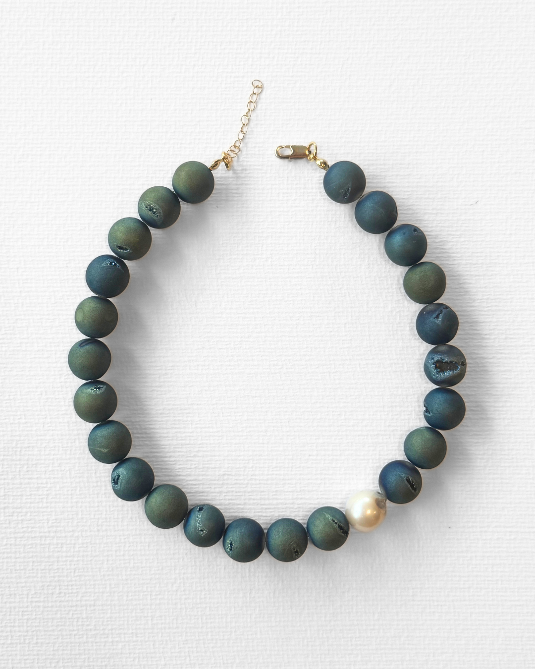 El yapımı bu özel kolyede, doğal druzy akik taşlarının mat dokusu ile barok incilerin eşsiz formu bir araya geliyor. Her biri kendine özgü yüzeye ve enerjiye sahip bu taşlar, hem günlük stilinize sofistike bir dokunuş katar hem de güçlü bir anlam taşır.
