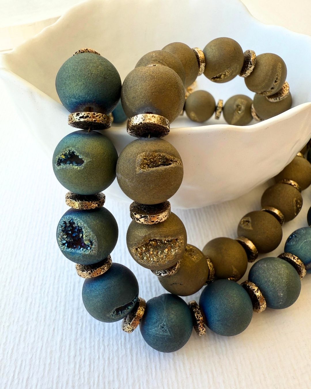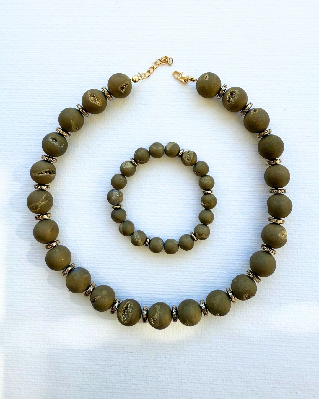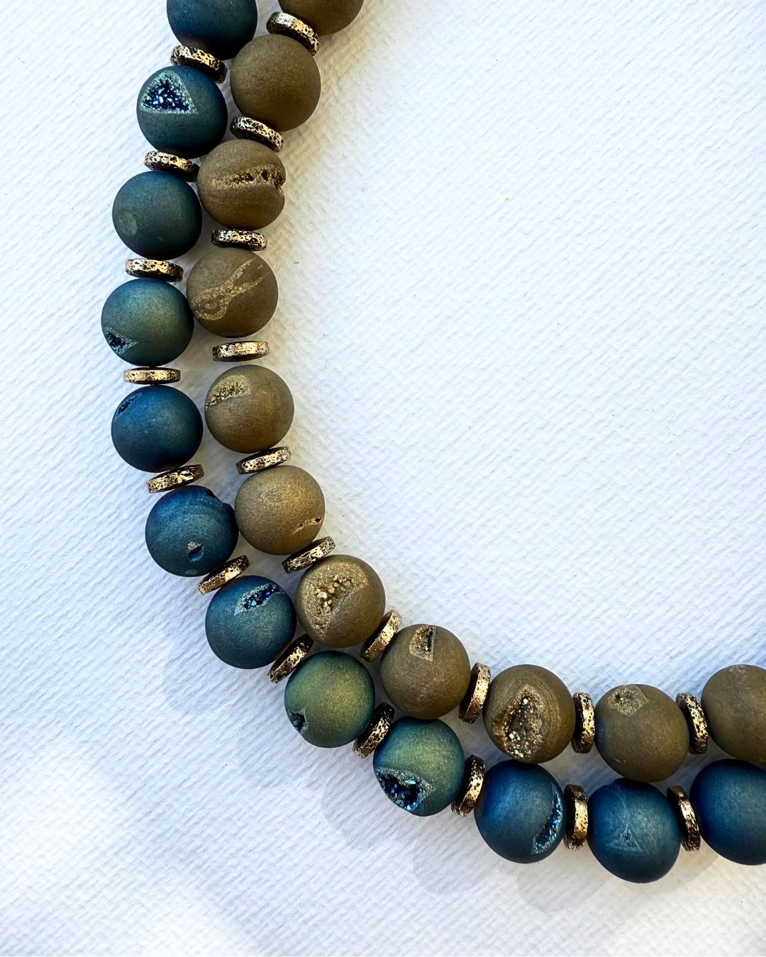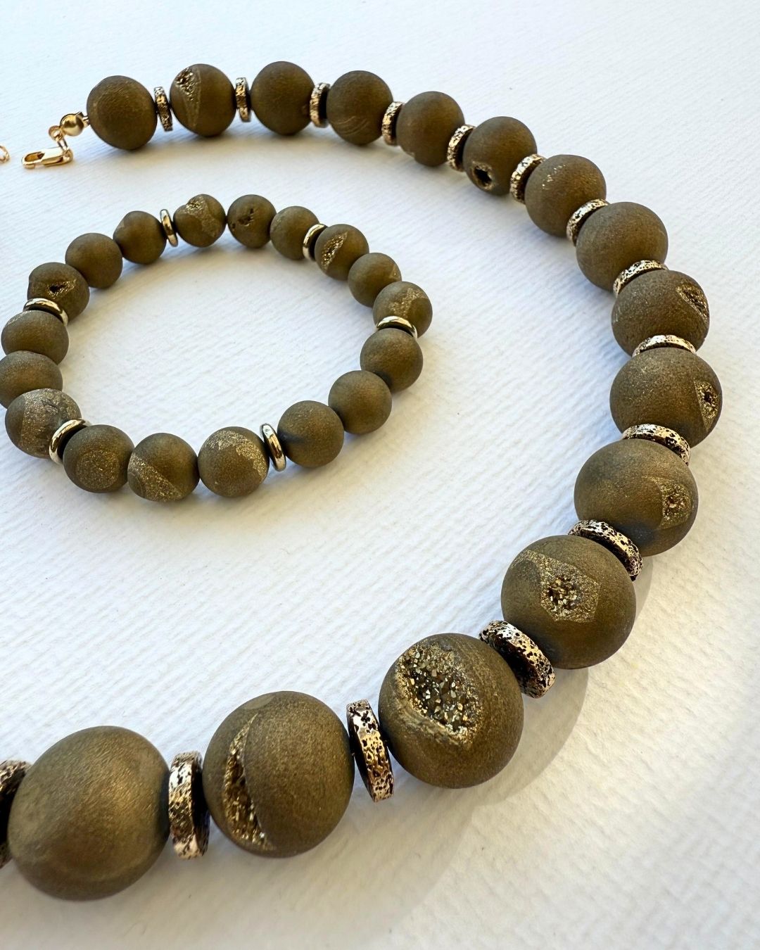 El yapımı bu özel kolyede, doğal druzy akik taşlarının mat dokusu ile lav taşının eşsiz parıltısı bir araya geliyor. Her biri kendine özgü yüzeye ve enerjiye sahip bu taşlar, hem günlük stilinize sofistike bir dokunuş katar hem de güçlü bir anlam taşır.