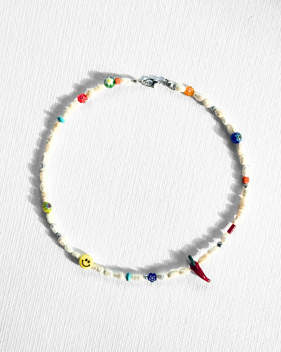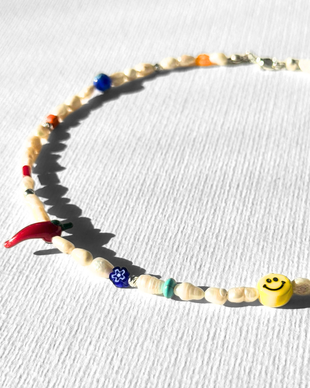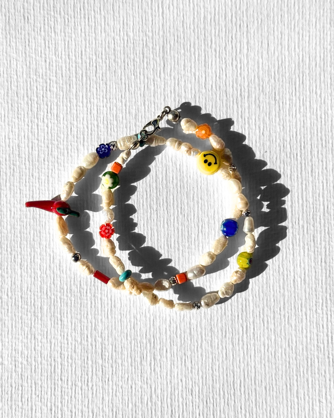 Karma kolye, sınırlı sayıdaki kapsül koleksiyonumuzun özel bir parçasıdır. Doğal incilerin asaletini, ışıltılı cam boncukların modernliğini ve Venedik’in büyüleyici Murano cam sanatının dokunuşunu bir araya getiriyor.
